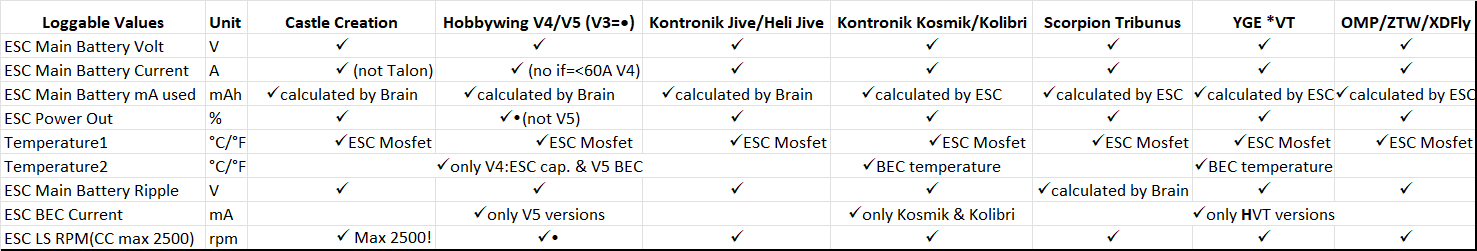 Come indicato nella stessa tabella, per alcuni modelli di ESC, viene gestito anche un secondo valore “Temperature2” che in alcuni casi indica la temperatura del BEC interno oppure la temperatura raggiunta dai condensatori elettrolitici di filtro (anche questa seconda temperatura può essere in gradi Celsius o in gradi Fahrenheit).