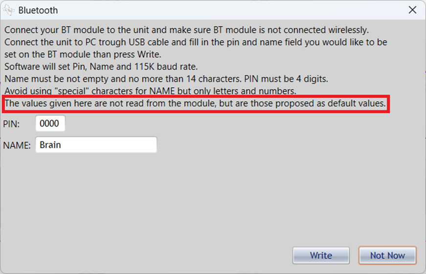 Please note that when you use the Windows app and select “Configure Bluetooth Module…” from the File menu, the NAME and PIN displayed are not the ones used by the device; rather, they are default names suggested by the Windows app, as explained in the text that appears in the window: