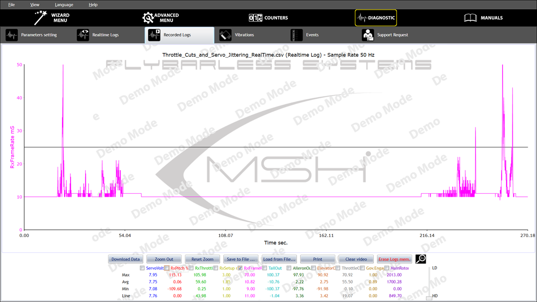 When the “RxFrameRate” curve is stable and clean, there is no interference on the RxPitch, RxThrottle, and Active Setup selection signals."