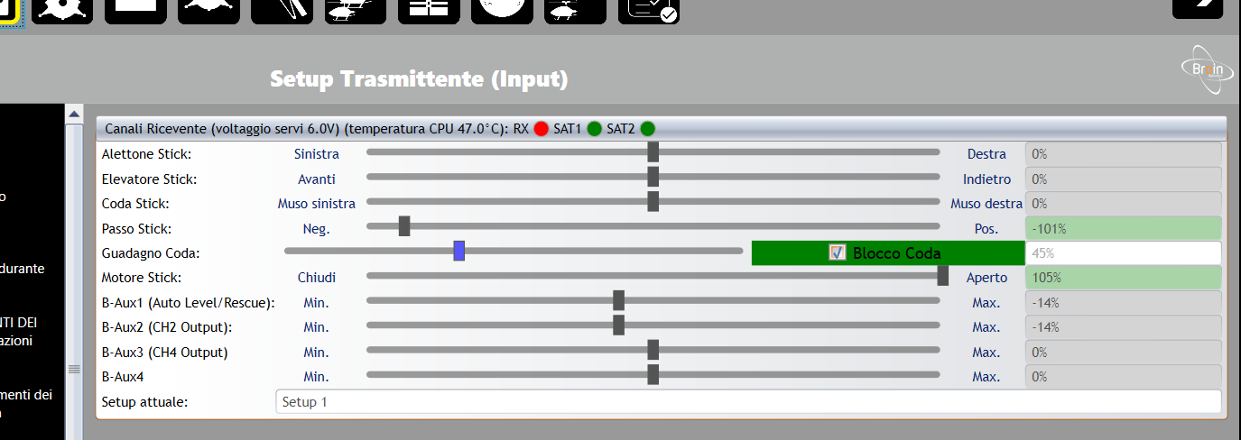 Salve, mi è successo una cosa strana sul RAW 420 con Brain2,esc Hobbywing 60 A. e 2 satelliti spektrum dopo aver impostato il tutto provo l'eli facendo delle leggere modifiche tramite il software e salvo il file di configurazione (del quale vi invio una copia) posizionando gli stick della radio in basso a dx. Il giorno dopo mi reco nuovamente al campo e collego la 6 celle al regolatore che emette i 6 bip di riconoscimento della batteria aspetto che il piatto faccia i movimenti, ma invece niente tutto morto a parte il bip cadenzato del regolatore....riprovo a fare il bind tramite il software del Pc e poi rifaccio la procedura il regolatore emette i 6 bip della batteria ma il piatto non si muove e l'esc continua ad emettere un bip cadenzato. Qualche suggerimento ? Grazie