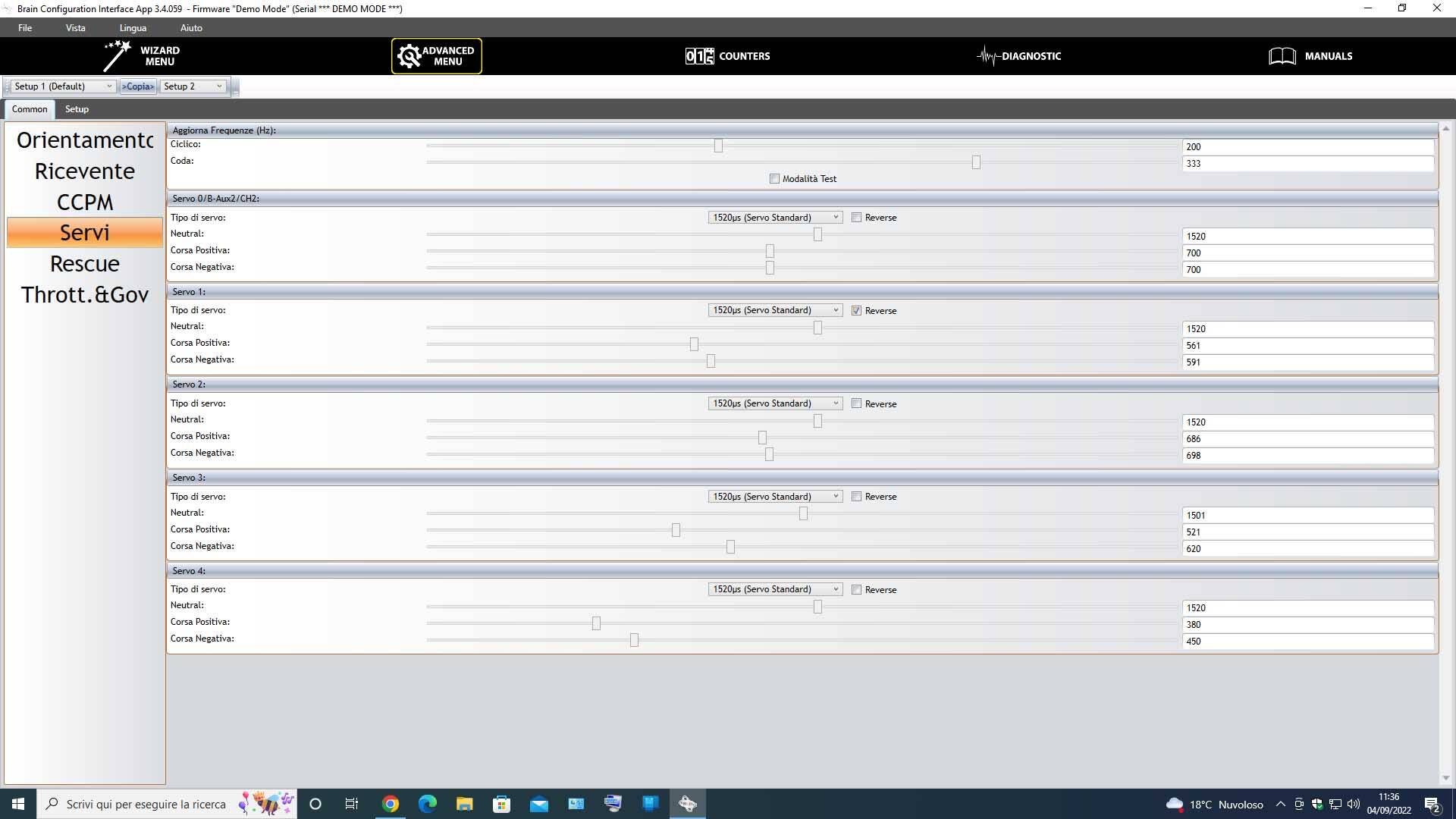 Nel software ho 1520 come punto centrale e standard consiglia 700usec corsa positiva e 700 usec corsa negativa.