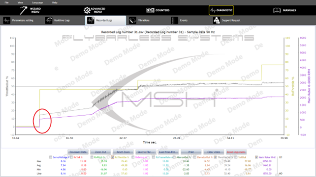 Dai grafici dei Flight Log che ci hai inviato è evidente il “salto” che fa la curva del segnale d’uscita “ThrottleOut” nel momento in cui il segnale in ingresso “RxThrottle” sale da zero al 45%.