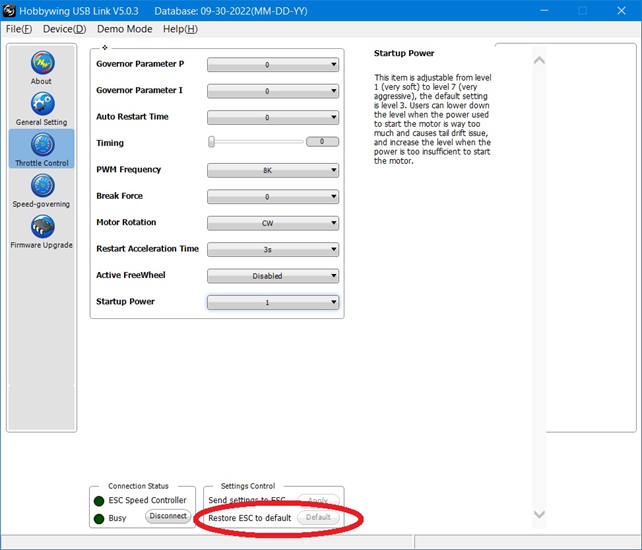 Per riportare l’ESC ai valori di default va usato l’apposito comando presente nel software Hobbywing USB Link:
